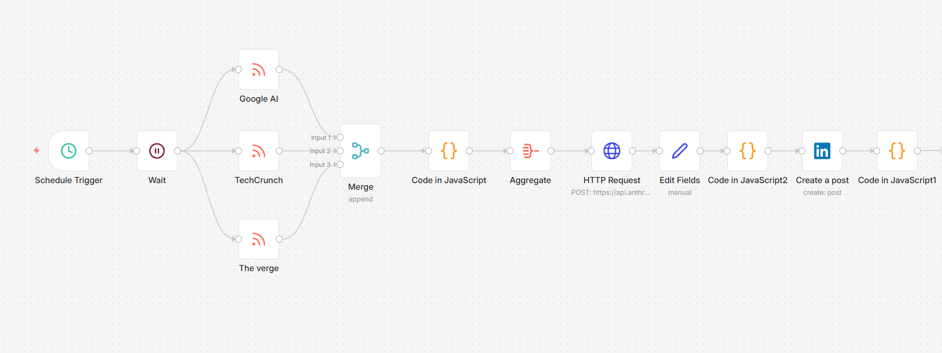 - Nodes utilisés : Schedule Trigger, Wait, RSS Feed Read, Merge, Code, Aggregate, HTTP Request, Edit Fields, LinkedIn