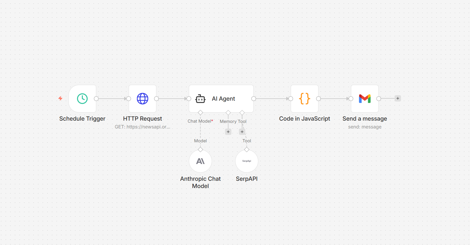 - Nodes utilisés : Schedule Trigger, HTTP Request, AI Agent, Code, Gmail